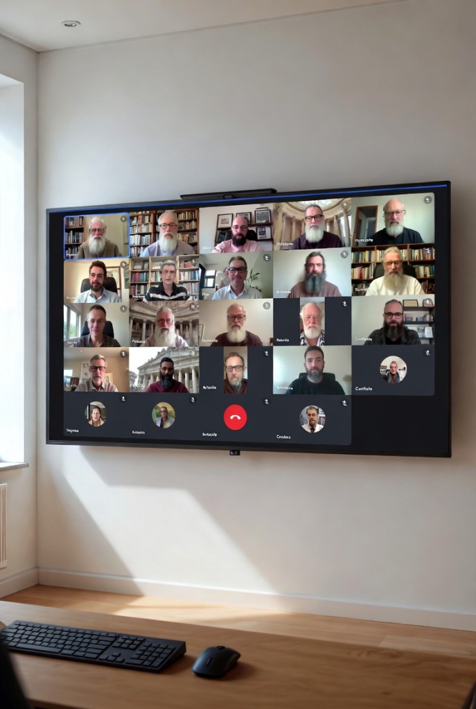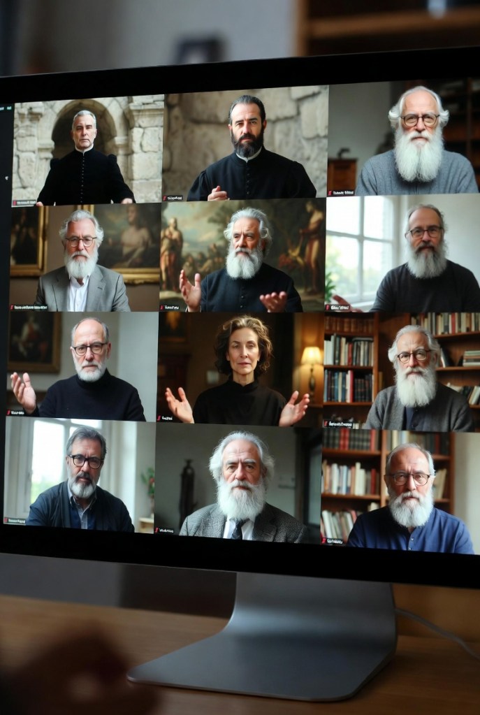 [Una gran pantalla asigna un espacio a cada participante, la mayoría aún sin conectar su cámara, aunque algunos de los que la conectan, miran alrededor y la vuelven a desconectar. Cada participante aparece en un cuadro de color y alguno de ellos da muestras de no entender demasiado la tecnología, miran a los lados, arriba y abajo, buscando una indicación que les dé confianza que lo han hecho bien. En el momento inicial solo los tres filósofos griegos muestran su rostro. El fondo de cada participante es de diferentes tonalidades, como si cada uno de ellos habitase bajo un cielo diferente, pero sabiendo todos que solo se trata de cielos ficticios. A veces, un tono azul intenso se despliega detrás de los pensadores, como si en lugar de estar hablando al aire libre estuvieran bajo el agua del mar. Otras veces, el fondo se torna dorado y cálido, simbolizando la iluminación que anhelan alcanzar a través del intercambio de ideas. En la parte superior de la pantalla se puede leer el siguiente lema: La filosofía es el vínculo entre la mente y la verdad].