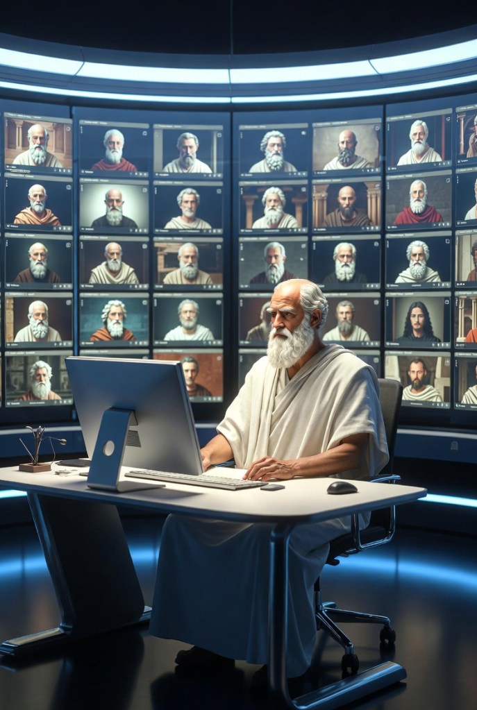 [Aristóteles] Dejadme opinar sobre este tema. Antes decirte, que me maravilló tu convocatoria, Sócrates. Siempre te he trasmitido que tu método de preguntar y cuestionar, tan arraigado en la esencia misma de la filosofía, ha sido una inspiración y una guía constante en mi búsqueda de la verdad y la comprensión del mundo que habitamos. En tus diálogos, cada pregunta es un nuevo horizonte que debemos explorar, saberse en deuda de responder siempre al nivel de la pregunta, buscando una luz, un destino, un baile de mentes para asentir con alegría al encontrar nuevos argumentos, nuevas realidades ocultadas, por no poder llegar a ellas sin la ayuda de una pregunta nunca planteada. No se marchita con el tiempo y las diferentes generaciones, tan dispares las de padres e hijos, pero siempre encontrando una autenticidad que amalgame a todas las generaciones, aunque hayan pasado cien de ellas, mil incluso. En este espacio digital, tan extraño en un principio, pero tan indispensable ahora que ya es conocido, espero ser guiado, Sócrates, por tu sabiduría, para ser, cada palabra, cada idea, un tributo a tu legado, un tributo a tu sacrificio, un deber de los que venimos después de honrar con la duda de nosotros mismos el recuerdo de tu propia duda, y a una idea tan universal como las constantes de la naturaleza.